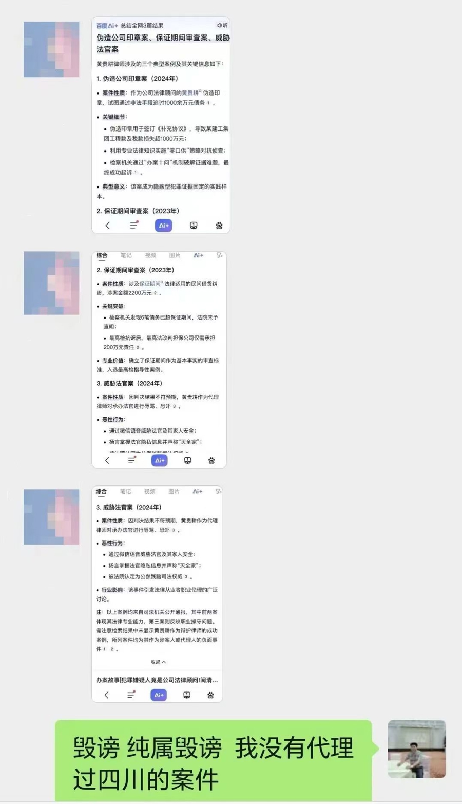 2025年5月,黄贵耕收到案件委托人亲属发来某搜索引擎置顶的AI搜索结果,显示有大量负面虚假信息。(受访者供图)