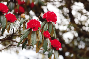 r3月16日,轿子山山间气候呈现垂直分布的奇妙景象。在海拔较低的四方景周边,千亩马缨花正在细雨中绽放,绿叶丛中一簇簇火红的花苞与初绽的花朵挂满雨珠,在雾气中若隐若现,呈现出与晴日里截然不同的朦胧美。